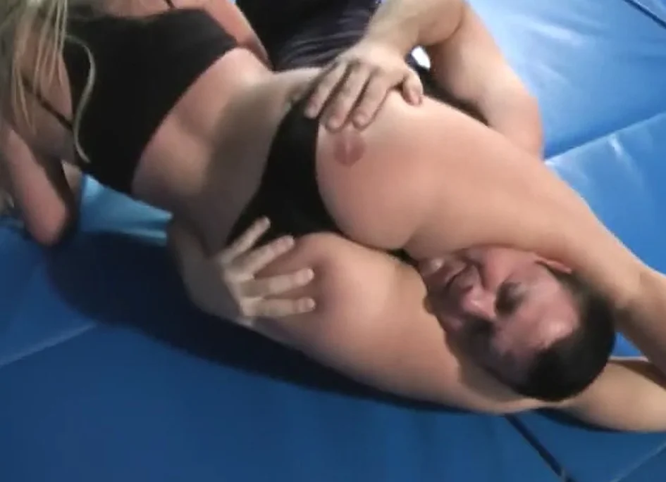 They both agree to a semi-competitive mixed wrestling match. Once LacyLynn wraps her thick thighs around his neck, she squeezes and he tries to break free. She totally dominates him on the mat.